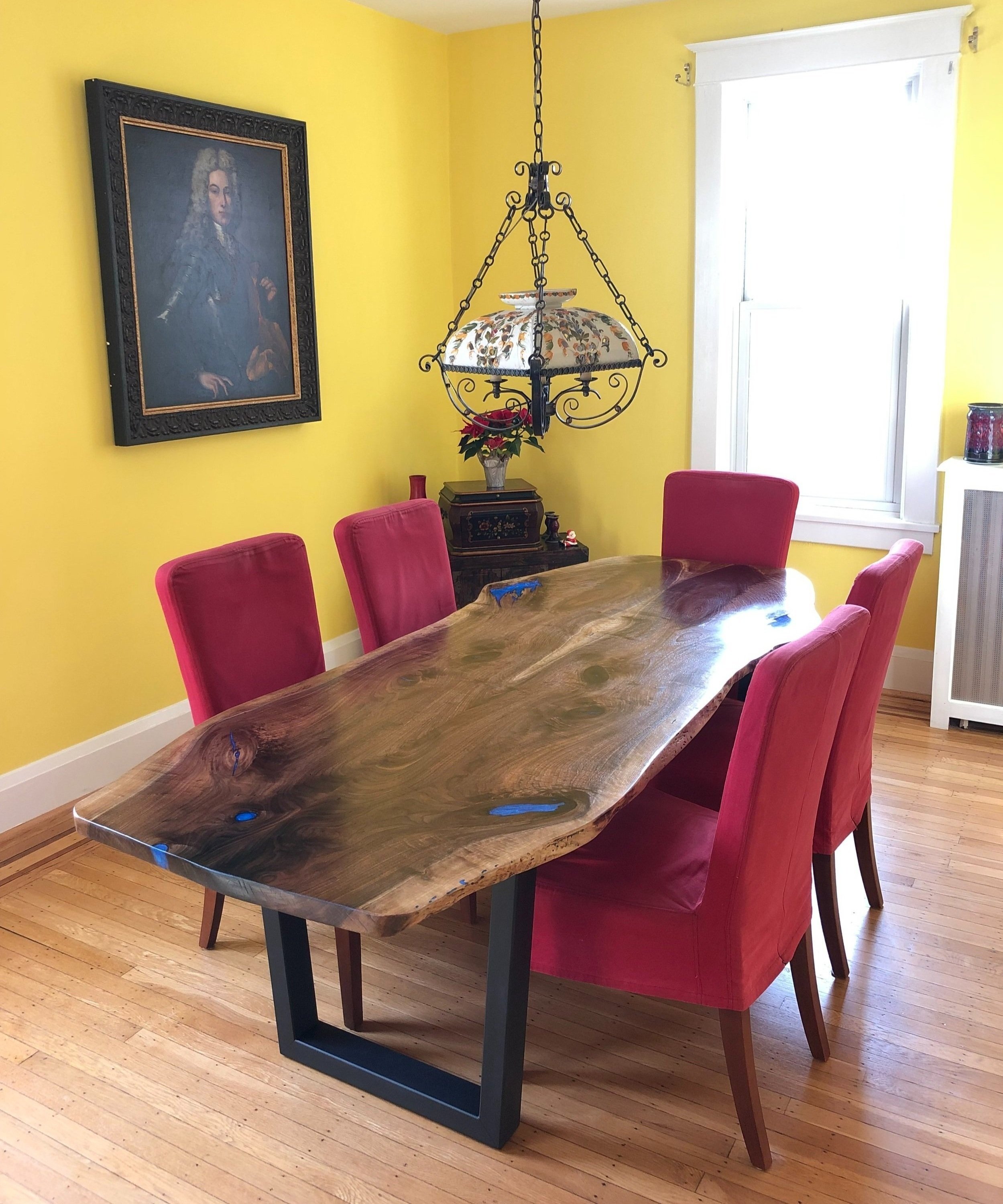 Over many weekends, I crafted the piece by hand. I cleaned and debarked every surface and sanded carefully until the slab was smooth. I filled its voids with blue-tinted epoxy, creating glassy lakes that moved with the wood’s contours. The finished table far exceeded our hopes—a rich, organic landscape of wood and resin that still anchors our dining room.